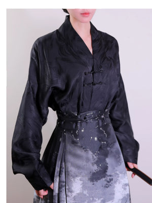 The Original Aircraft Sleeve Shirt is a statement pairing piece for the modern hanfu wardrobe. The jacquard dark pattern — woven into the fabric rather than printed on top — gives the shirt a depth and tactility that reads as genuinely premium, while the aircraft sleeve silhouette creates the sweeping, cinematic movement that photographs so beautifully in natural light. In Black, the shirt pairs powerfully with richly coloured horse-face skirts — deep reds, navy blues, and forest greens — for a high-contrast, editorial look. In Beige, it functions as a luminous neutral, complementing the full spectrum of horse-face skirt colourways with an understated elegance. Both colourways are equally versatile for photography, events, and everyday modern hanfu styling.