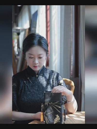 The Bamboo & Bird Motif Crossbody Bag is an accessory that carries the weight of Chinese aesthetic tradition in the lightest possible way. The bamboo and bird motif — rendered in gold against a deep black ground — is one of the most beloved images in Chinese literati art: bamboo for resilience and integrity, the bird for freedom and poetic spirit. Together, they create a visual language that is immediately recognisable to anyone familiar with Chinese ink-wash painting, and quietly beautiful to anyone who is not. The gold tassel adds a note of warmth and movement that animates the bag as you walk; the bead chain strap — whether in standard black or the upgraded jade bead option — adds texture and a distinctly Chinese aesthetic quality that sets this bag apart from any Western crossbody. Worn with Hanfu, Qipao, or new Chinese style daily wear, this bag is the finishing detail that completes the look.