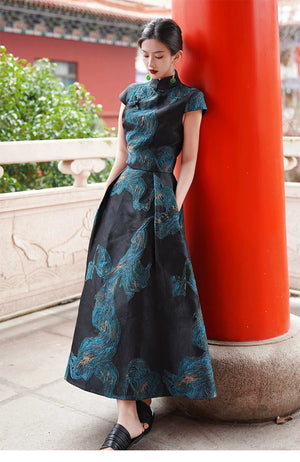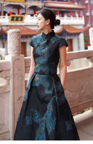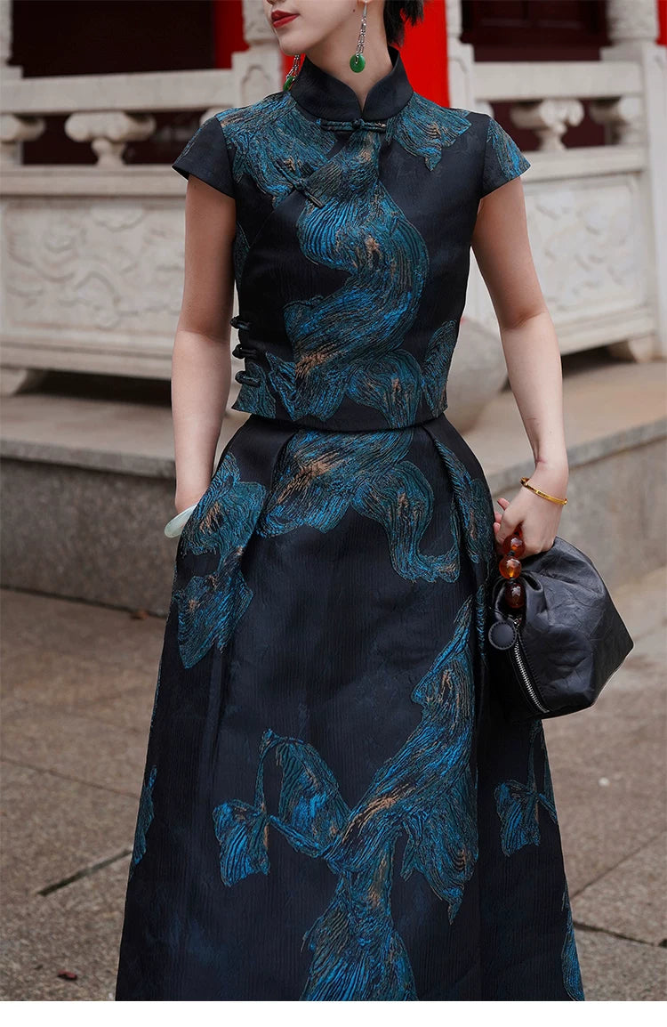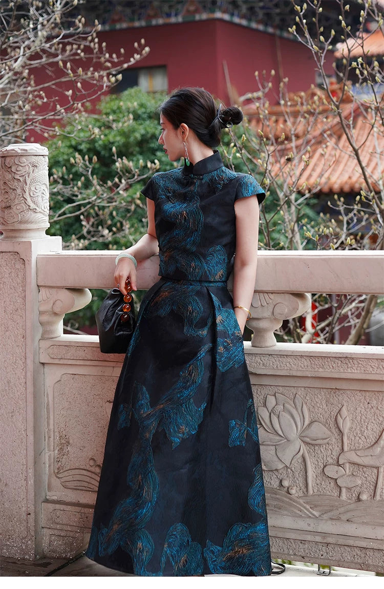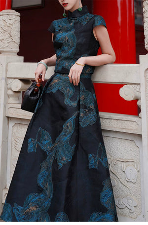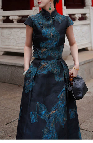 'Fengluan Jinzun' New Chinese Style Silk Gilt Embroidered Cheongsam Top & Skirt Set