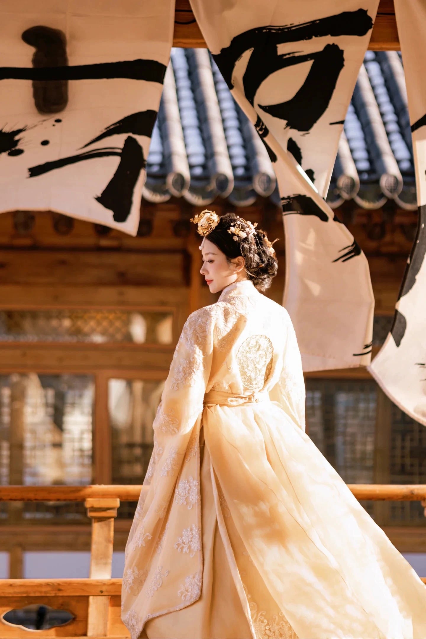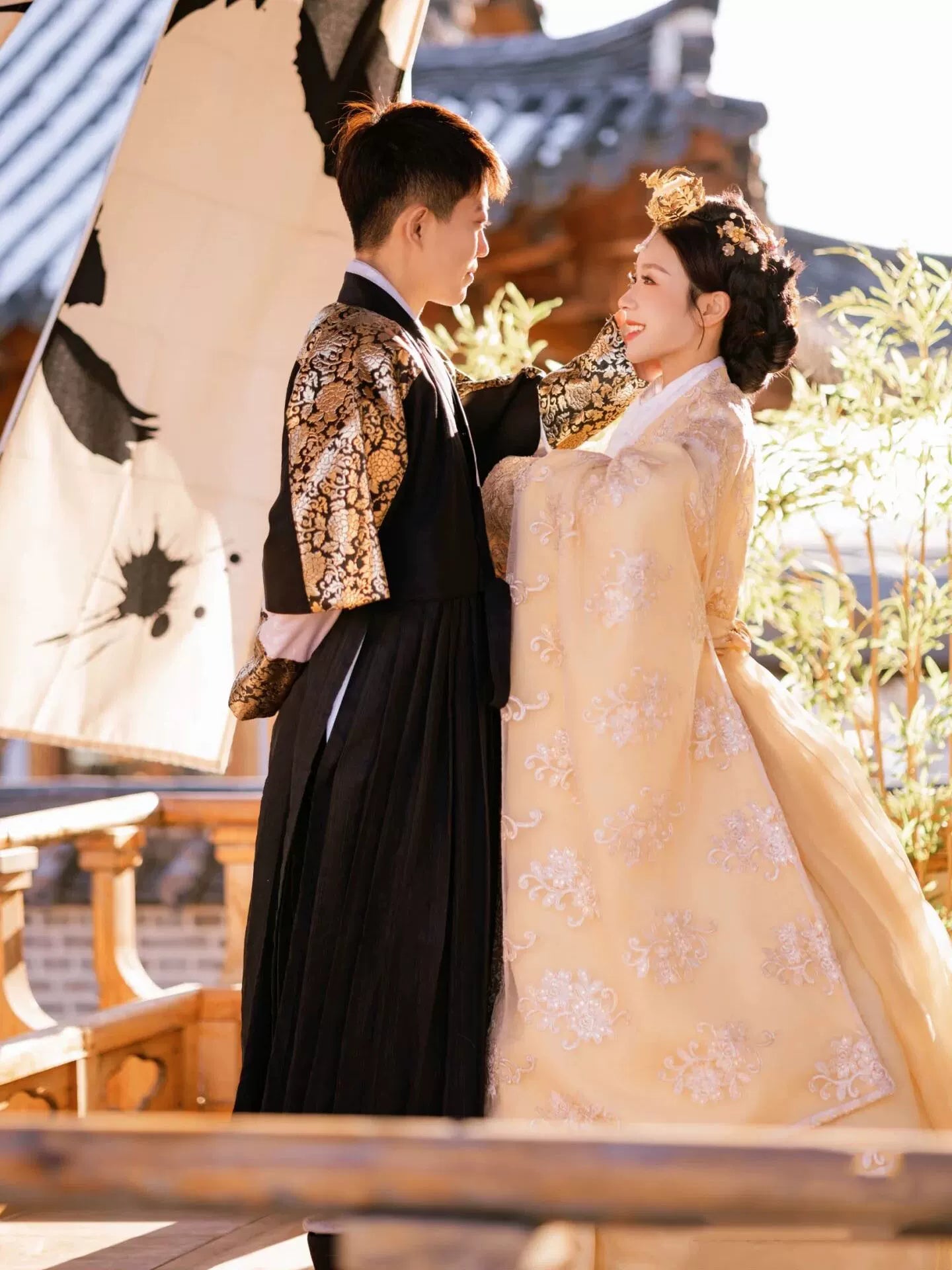 Couple Hanbok Wedding Outfit – Korean Palace Style Dress with Lace Detail for Summer Photoshoots