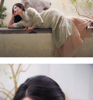 Emerald Flowing-Sleeve Qipao – New Chinese Silhouette with Full Opening & Elegant Plus-Friendly Fit