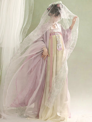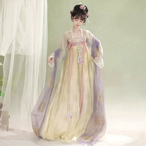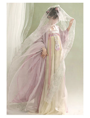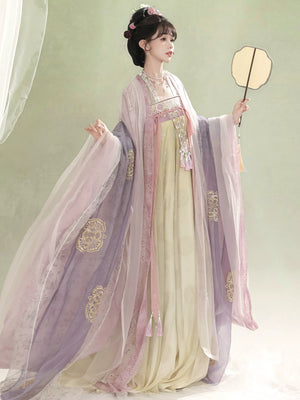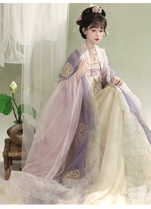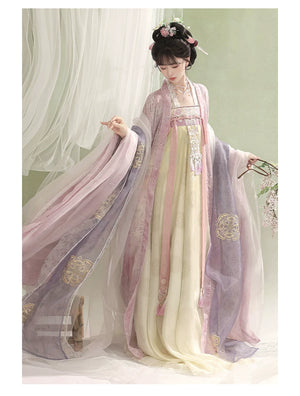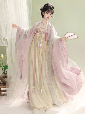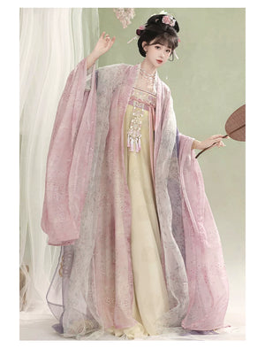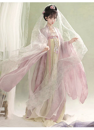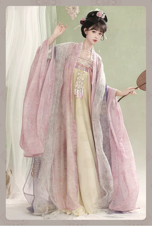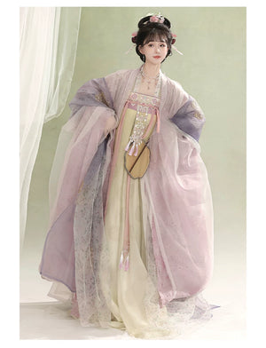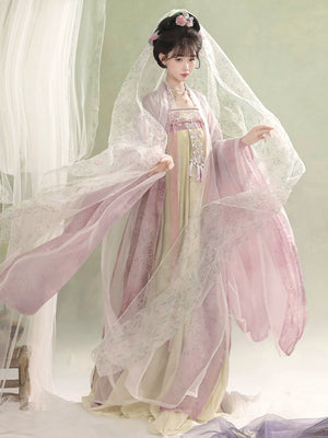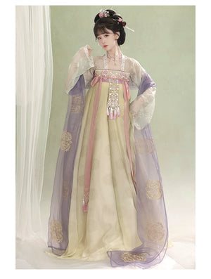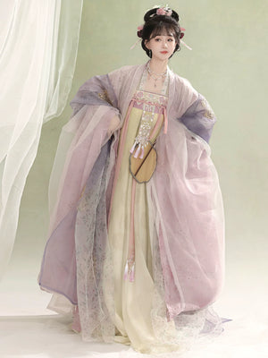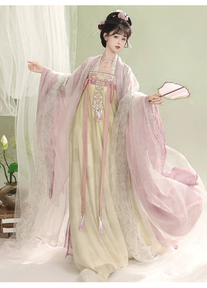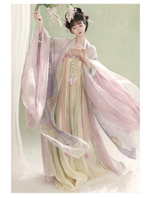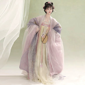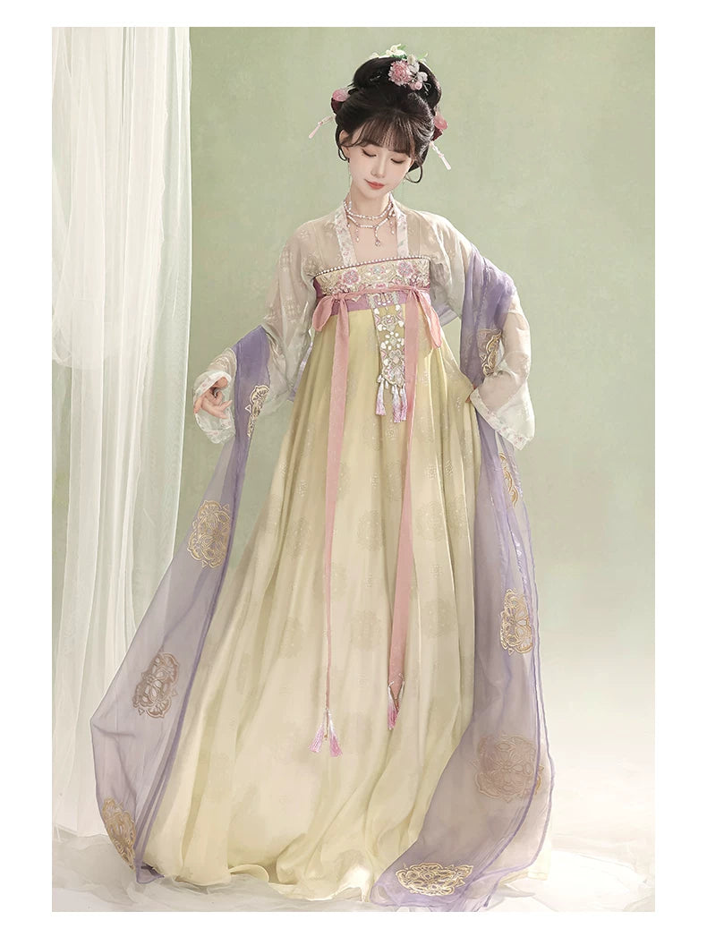 Ethereal, historically inspired, and crafted with heavy-industry artistry — the Hua Chenxiyue Tang Dynasty Hanfu Set is an original design that captures the flowing grandeur of Tang court fashion. With its sweeping wide-sleeve large-sleeved shirt, dramatic chest-length eight-panel broken skirt, and delicate silk accessories, this traditional Tang hanfu ensemble is designed for the woman who wears history with grace.