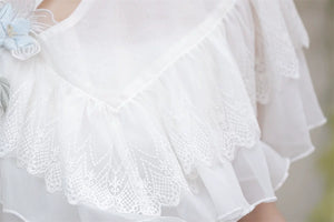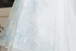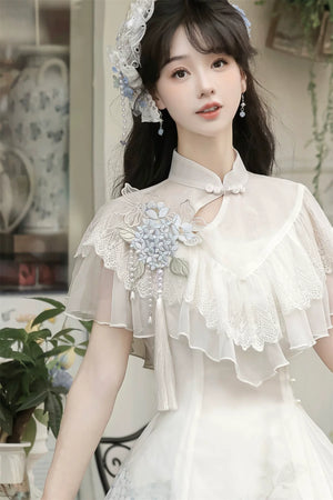 - Shawl (short-sleeve outer layer) — delicate short-sleeve shawl with hydrangea print and soft lace trim