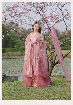 Ethereal, delicate, and richly crafted — the Jade Art 「Moon Cutting Cherry」 Hanfu Set is a complete four-piece improved hanfu ensemble designed for the spring and summer fairy aesthetic. Featuring heavy industry embroidery, flowing large water sleeves, and a layered silhouette that moves with effortless grace, this set is ideal for hanfu photography, cultural events, outdoor shoots, and everyday fairy-style wear.