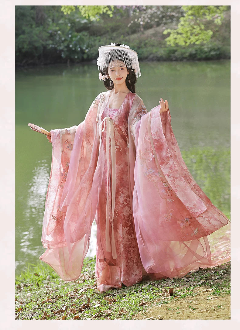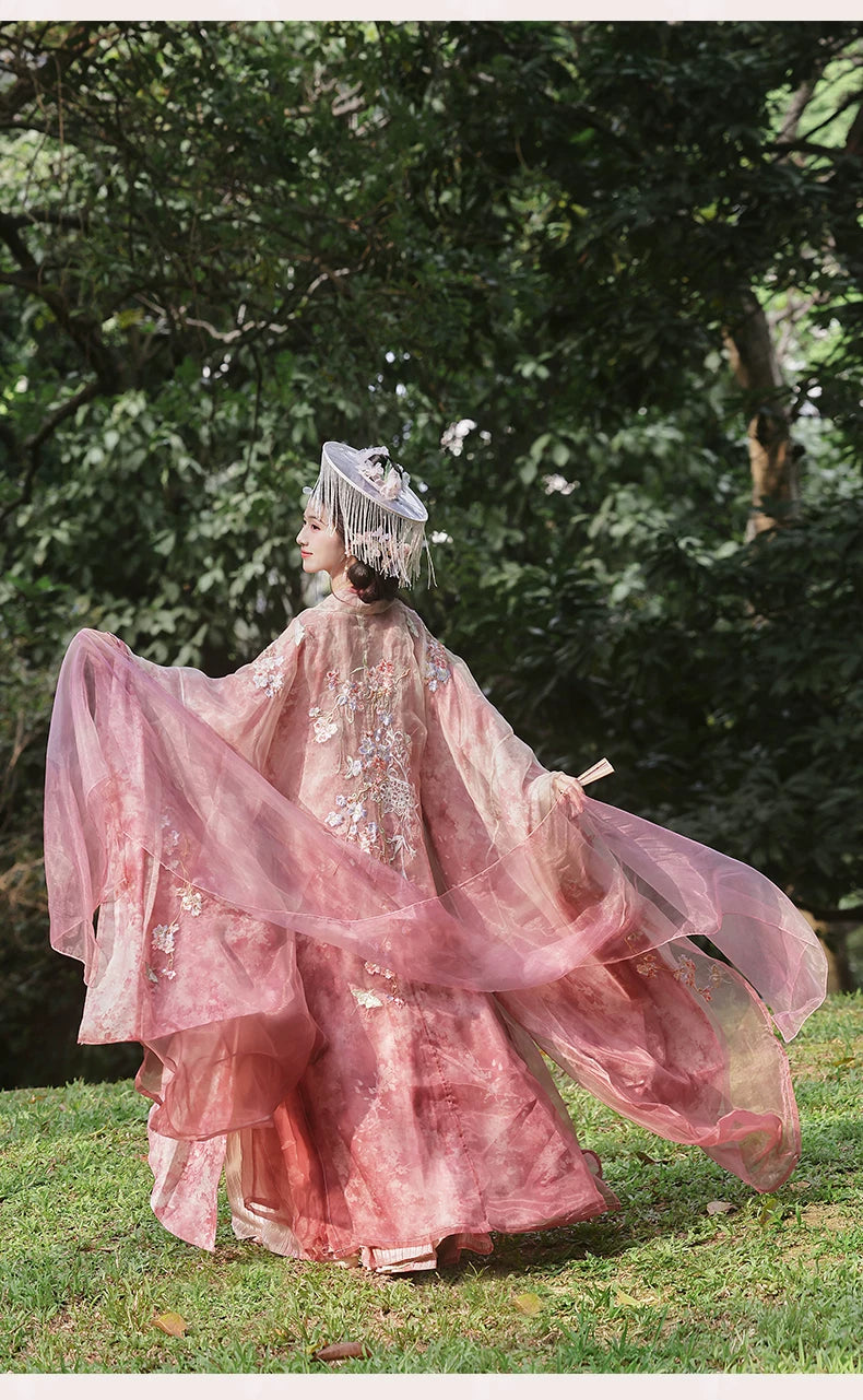 The 「Moon Cutting Cherry」 Hanfu Set is a study in layered, ethereal beauty. The outer large sleeve shirt — with its sweeping water sleeves and heavy embroidery — creates a dramatic, cinematic silhouette that photographs beautifully in natural light. Layered over the inner sleeve shirt and suspender top, the ensemble achieves the characteristic depth and dimension of traditional hanfu layering, while the improved construction ensures genuine comfort and ease of movement. The lower skirt, with its adjustable tie waist and flowing length, completes the look with a grounded, graceful foundation. Style with floral hair accessories, embroidered shoes, and traditional hanfu jewellery for a complete fairy aesthetic.