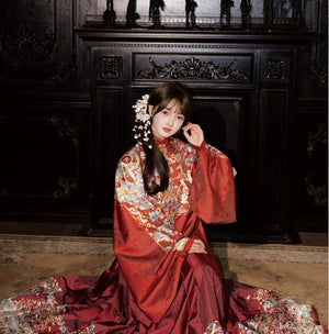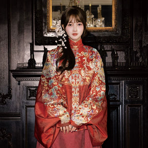 The Ming Dynasty cross-collar jacket (对襟袄) is a classic piece of traditional Chinese clothing characterized by its symmetrical front opening and elegant silhouette. Paired with the iconic Mamian skirt (马面裙), one of the most representative styles of traditional Chinese women's clothing, this set embodies the refined aesthetics of Ming Dynasty fashion.