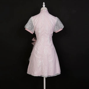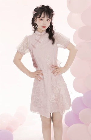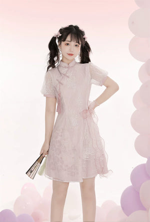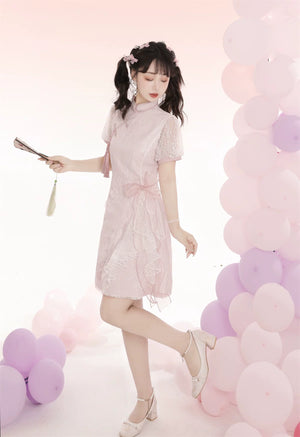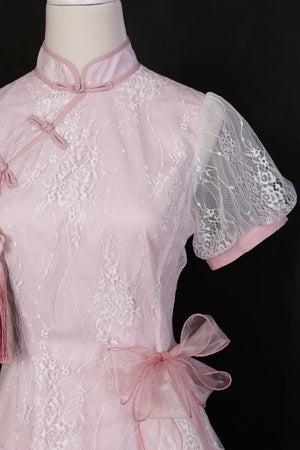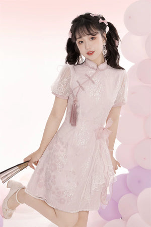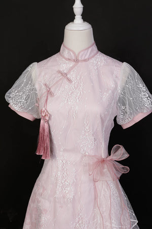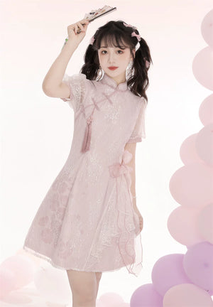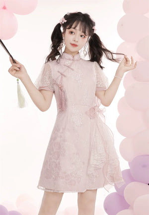 Han Element Peach Blossom Crisp Lace Short-Sleeved Tassel Sweet Improved Cheongsam Fairy Dress