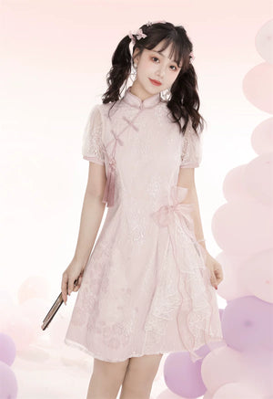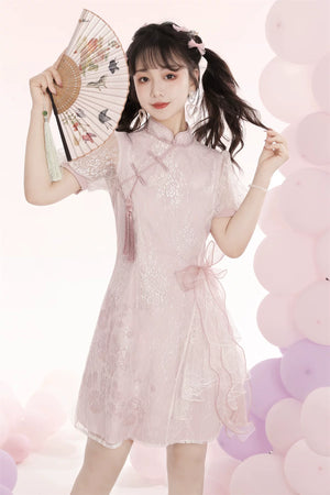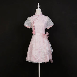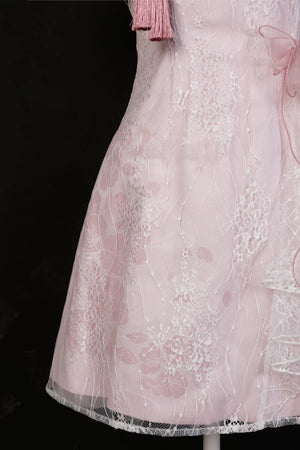 Soft, romantic, and delicately feminine — this improved cheongsam fairy dress reimagines the classic Chinese qipao silhouette through a sweet, dreamy lens. Featuring delicate peach blossom lace detailing, a flowing skirt with tassel trim, and a soft pastel palette, this dress is the perfect fusion of traditional Chinese elegance and modern sweet fashion.