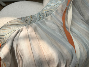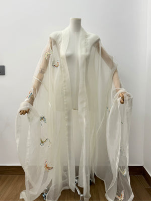- Cloud Apricot Baidie Outer Big Sleeve (云杏色百蝶刺绣外大袖衫) — $99 — S/M/L/XL — 100% polyester imitation silk gauze (仿真丝纱), semi-sheer. Butterfly embroidery outer robe with dramatic wide sleeves.