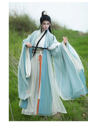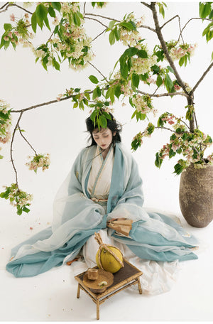 - Four-Piece Complete Set (四件套) — $226 — S/M/L/XL — Baidie outer sleeve + inner sleeve + collar + pleated skirt. Best value — everything you need for a complete Song Dynasty hanfu look.