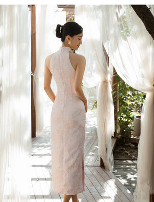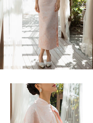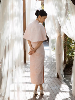 The pink cheongsam (粉色旗袍) is one of the most beloved choices in the Chinese bridal wardrobe — a colour that carries the warmth of celebration, the softness of new beginnings, and the quiet joy of the most significant moments in a woman's life. In the context of the cheongsam silhouette — the fitted waist, the stand collar, the floor-length hem — pink becomes something extraordinary: luminous, romantic, and deeply Chinese in its aesthetic resonance. The matching shawl adds a layer of warmth and visual completeness that transforms the qipao from a dress into a full ensemble — perfect for the wedding morning ceremony, the bridal suite, or any occasion that calls for a look of considered, intimate elegance. Pair with pearl or rose gold jewellery, a soft updo, and heeled shoes in nude or blush for a complete, harmonious look.