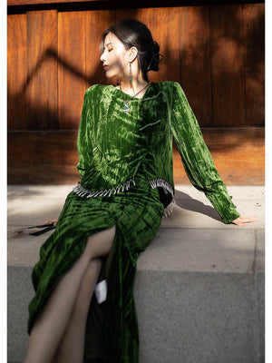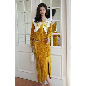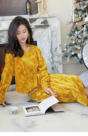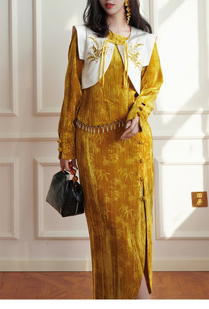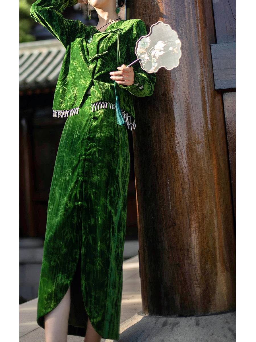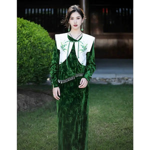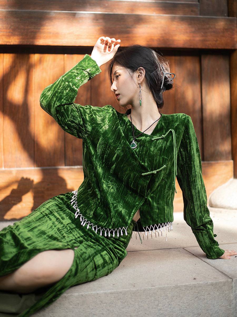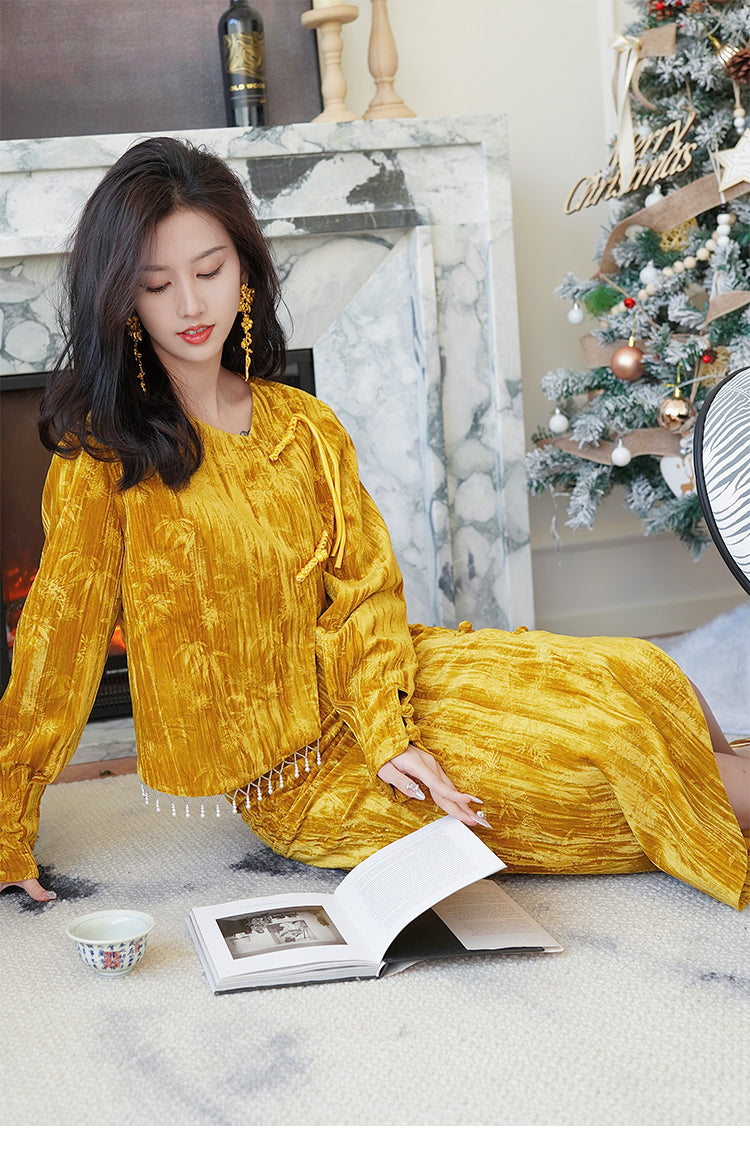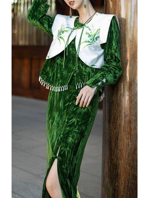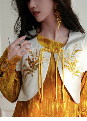[Qianshan Jade] Neue chinesische Scheibenschnalle Perlen importiert goldenen Samt Top Halbrock Weste Set