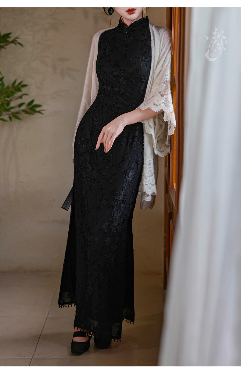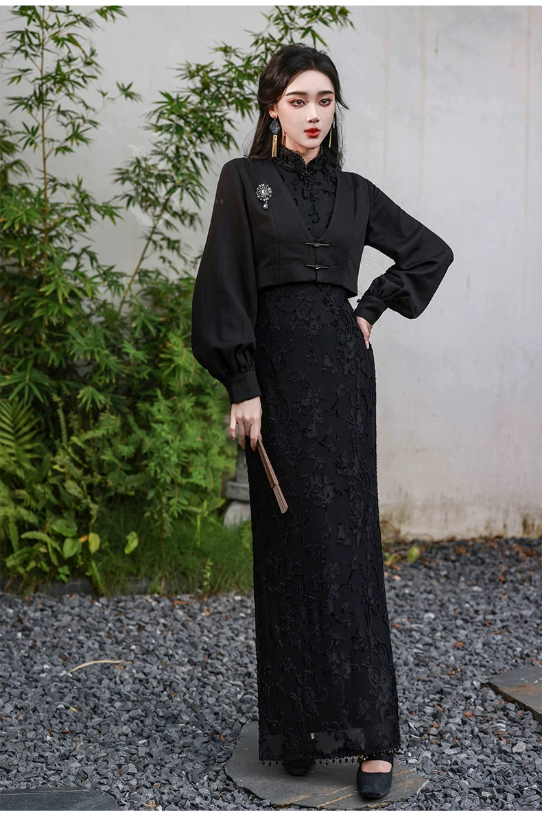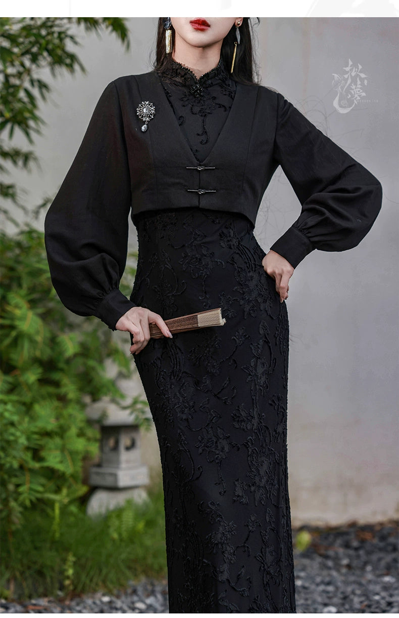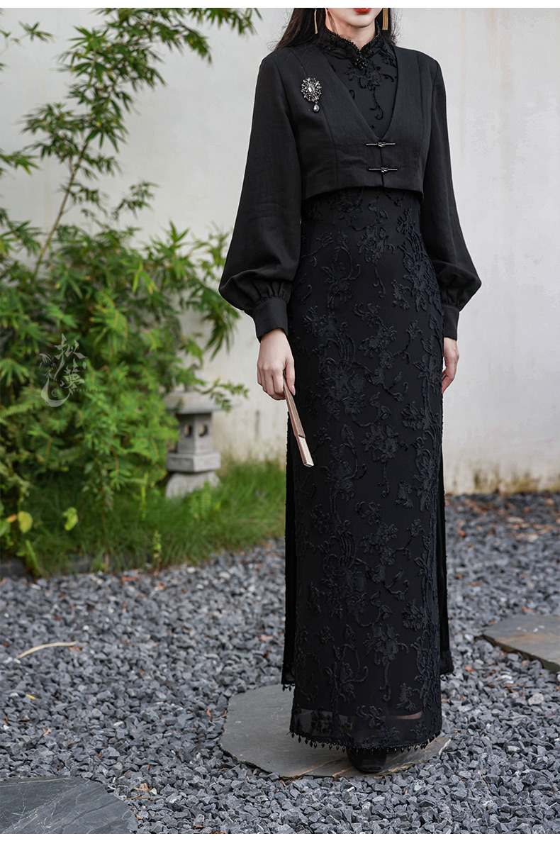 Silent Fragrance – Velvet Beaded Sleeveless Floor-Length Qipao with New Chinese Style Blazer
