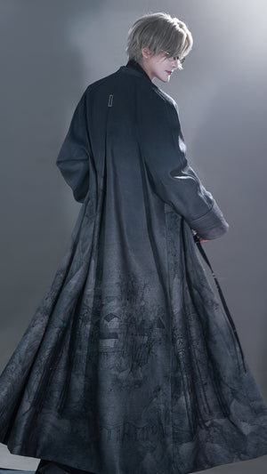 Rivers and Mountains Wool Coat - Black Grey Gradient Chinese Landscape Print Overcoat