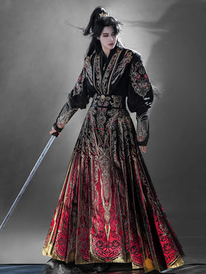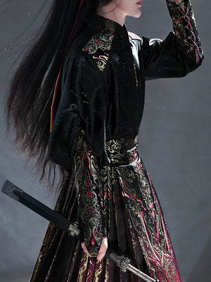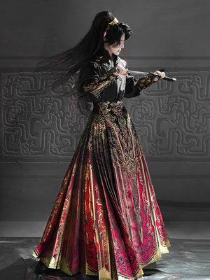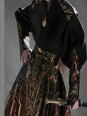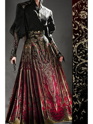 Experience the grandeur of ancient Chinese royalty with this exquisite "Kings and Generals" hanfu set. Featuring a stunning red-gold brocade horse face skirt (马面裙) paired with an intricately embroidered jacket, this ensemble captures the essence of traditional Chinese elegance and craftsmanship.