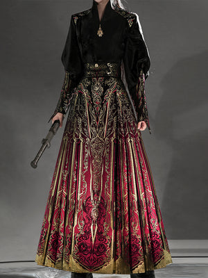 Red Gold Brocade Horse Face Skirt Set - Luxury Chinese Embroidered Hanfu Ensemble