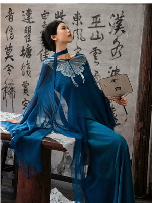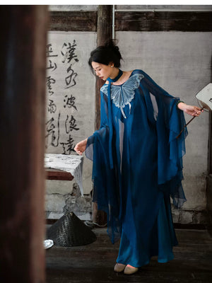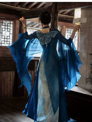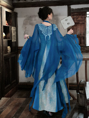 'Qingshan Line' New Chinese Style Blue Butterfly Lace Embroidery Cardigan & Tencel Jacquard Dress Set
