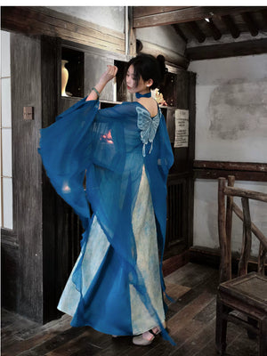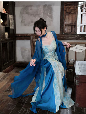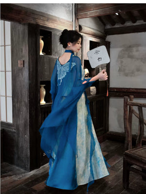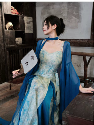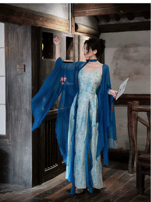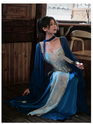 「Qingshan Line」 New Chinese Style Blue Butterfly Lace Embroidery Cardigan & Tencel Jacquard Dress Set