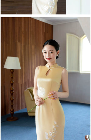 National Style Embroidery Gold Cheongsam | Acetate Satin | Cheongsam Bridal Gown | Toast & Engagement Dress