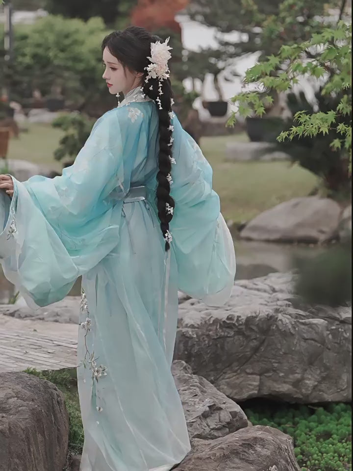 Blue & Green Hanfu Women's Large Sleeve Shirt Embroidery Spring and Summer