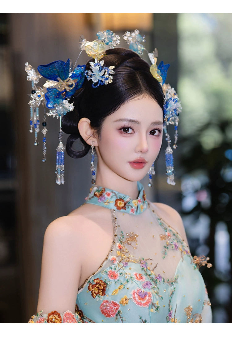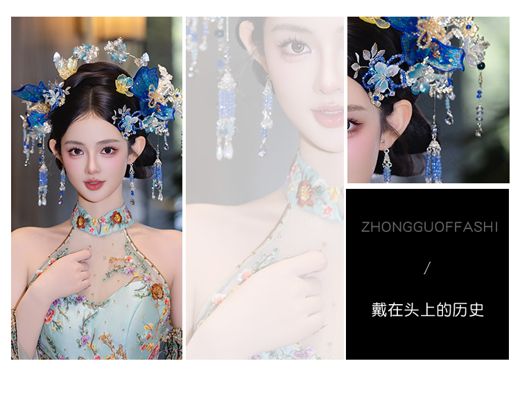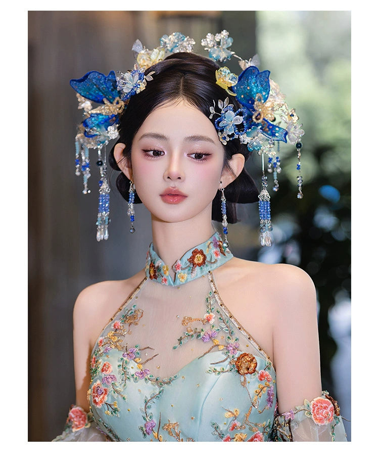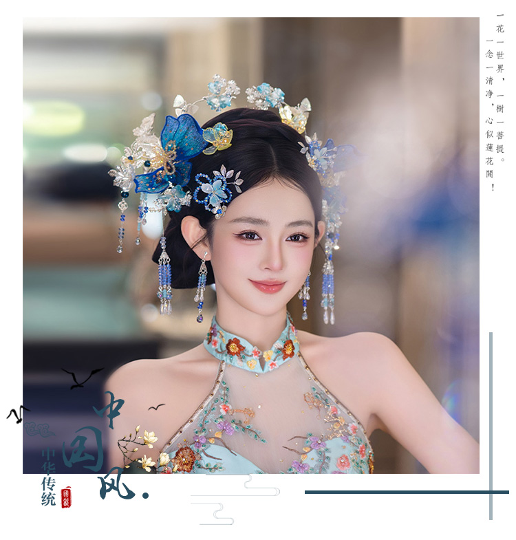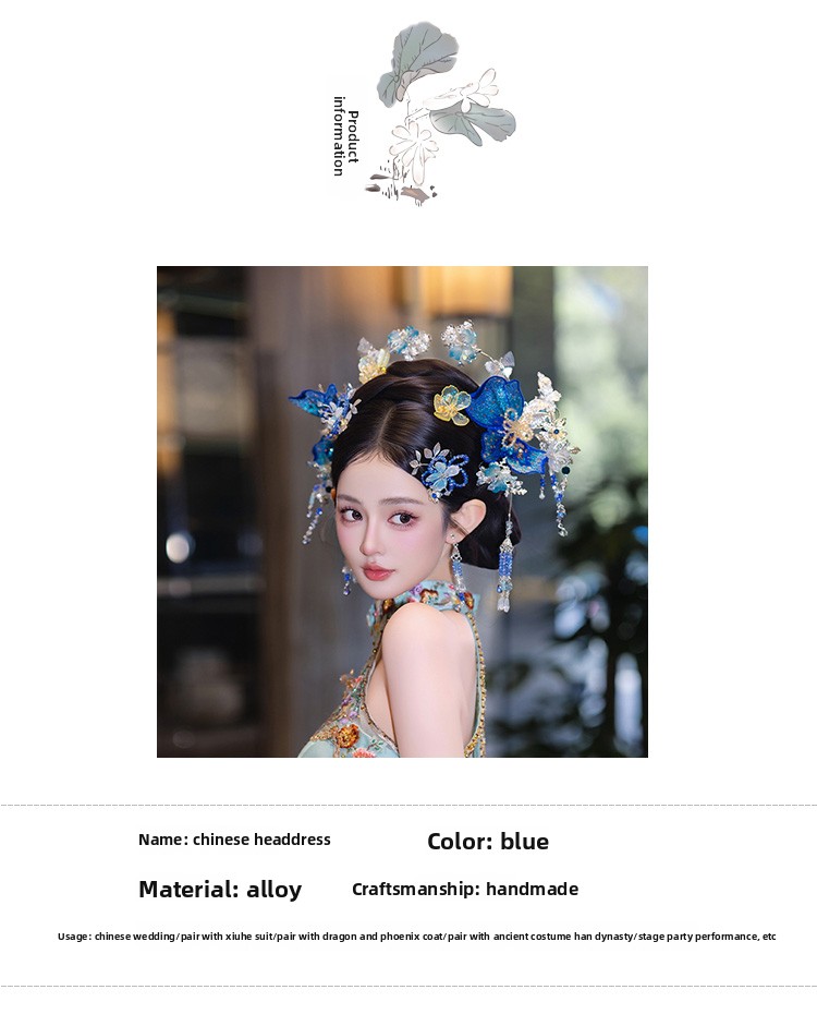Blue Floral Chinese Bridal Hairpin Set – Elegant Hanfu & Qipao Headpiece for Wedding