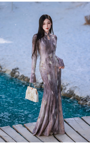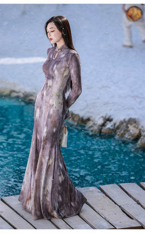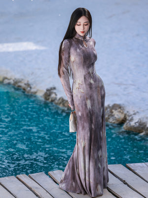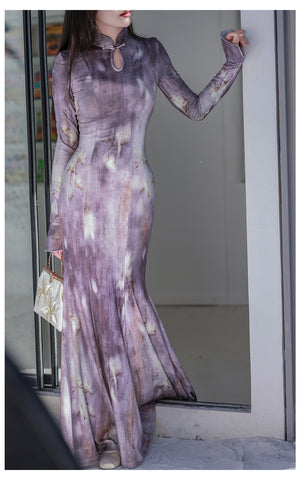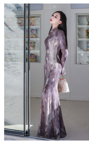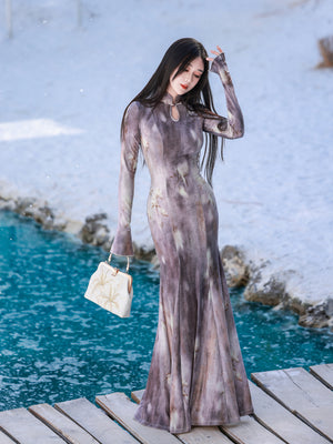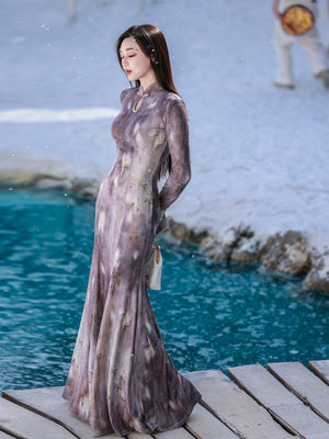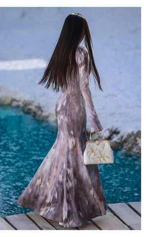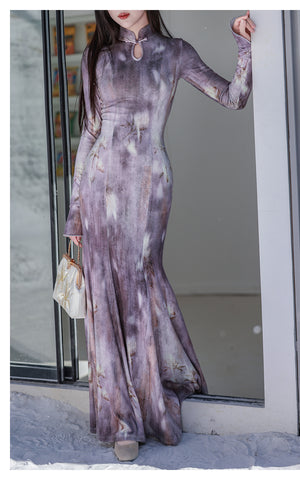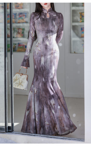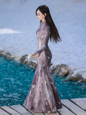 Knitted Mermaid Cheongsam with Exquisite Lotus Print