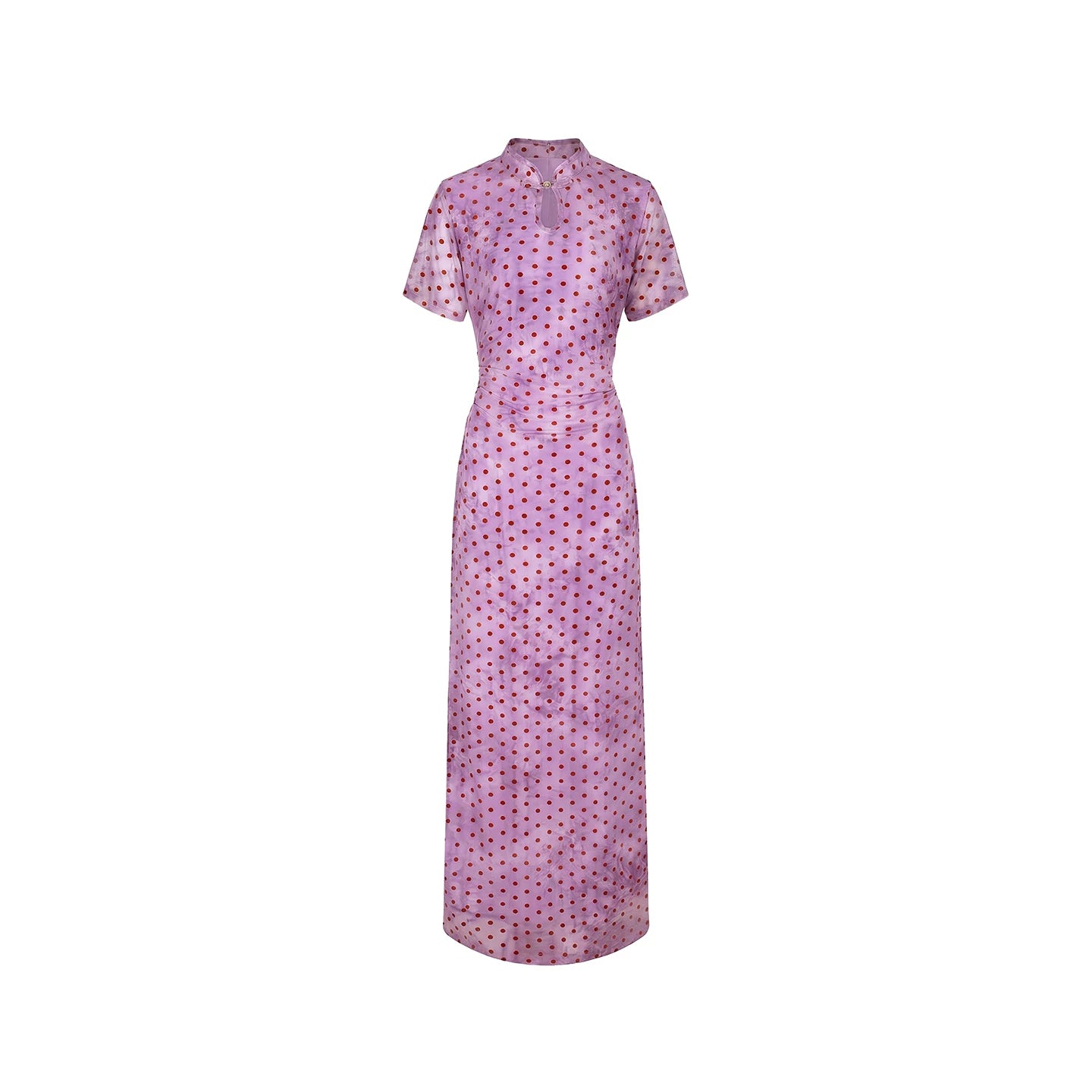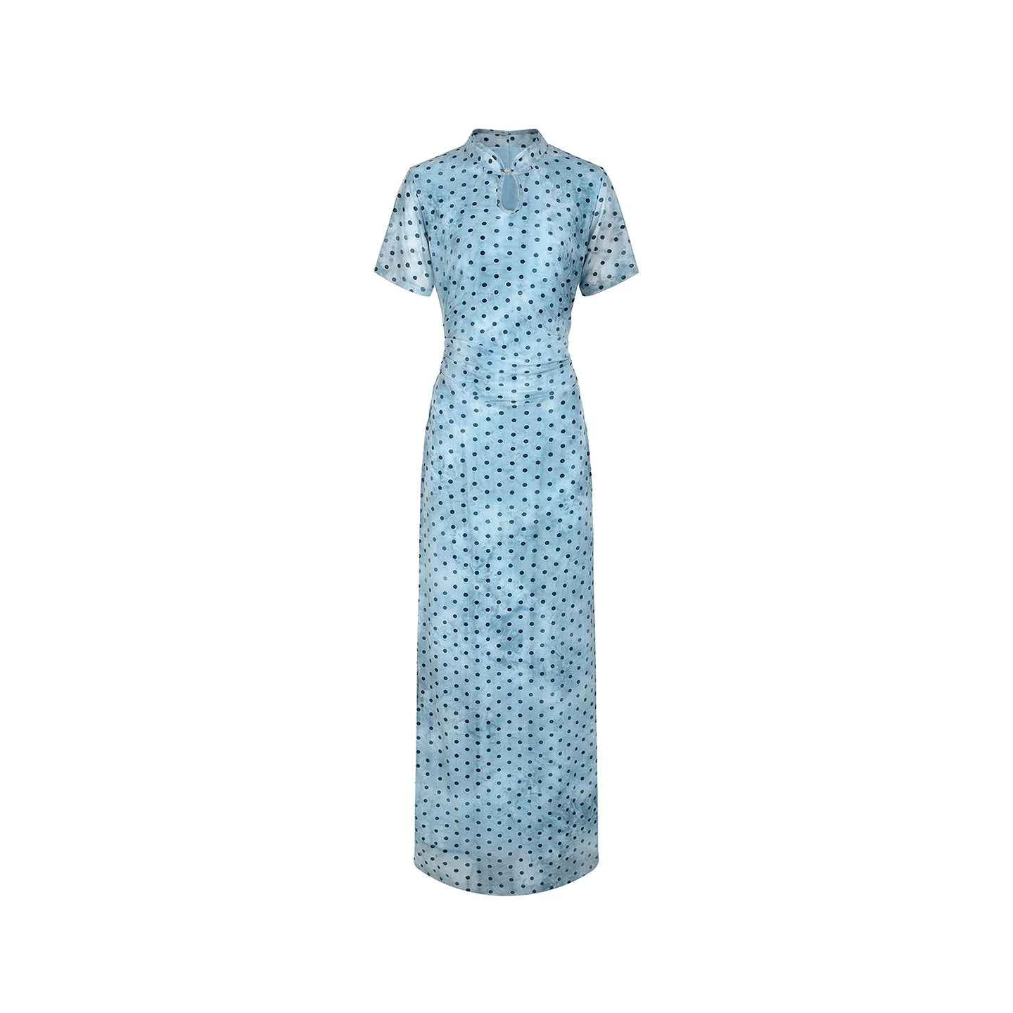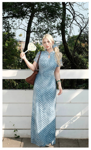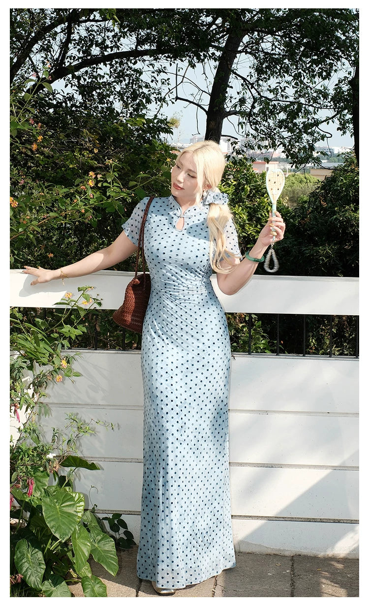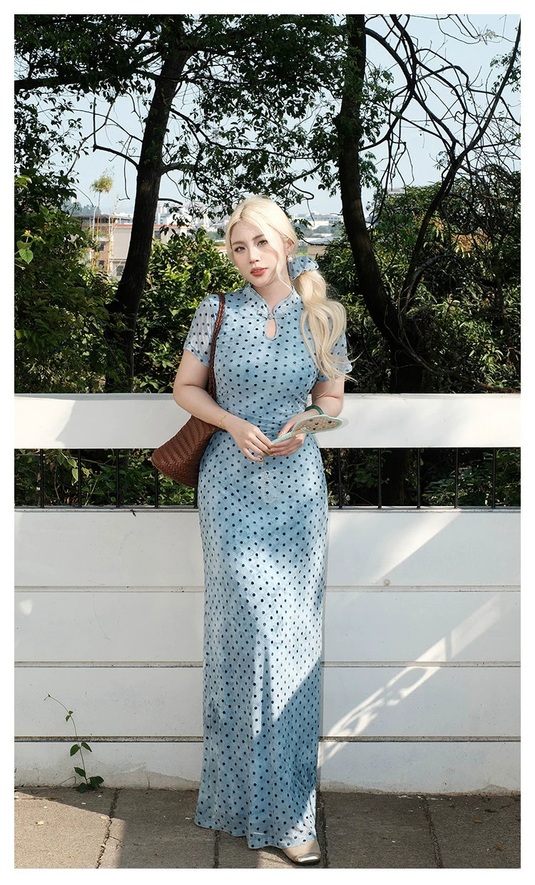 "Danqing Dian" – Polka Dot Improved Cheongsam | Water Drop Collar Long Qipao