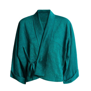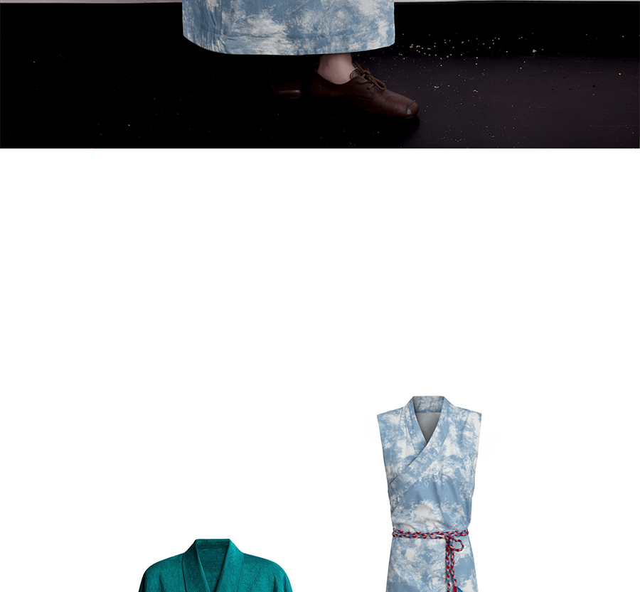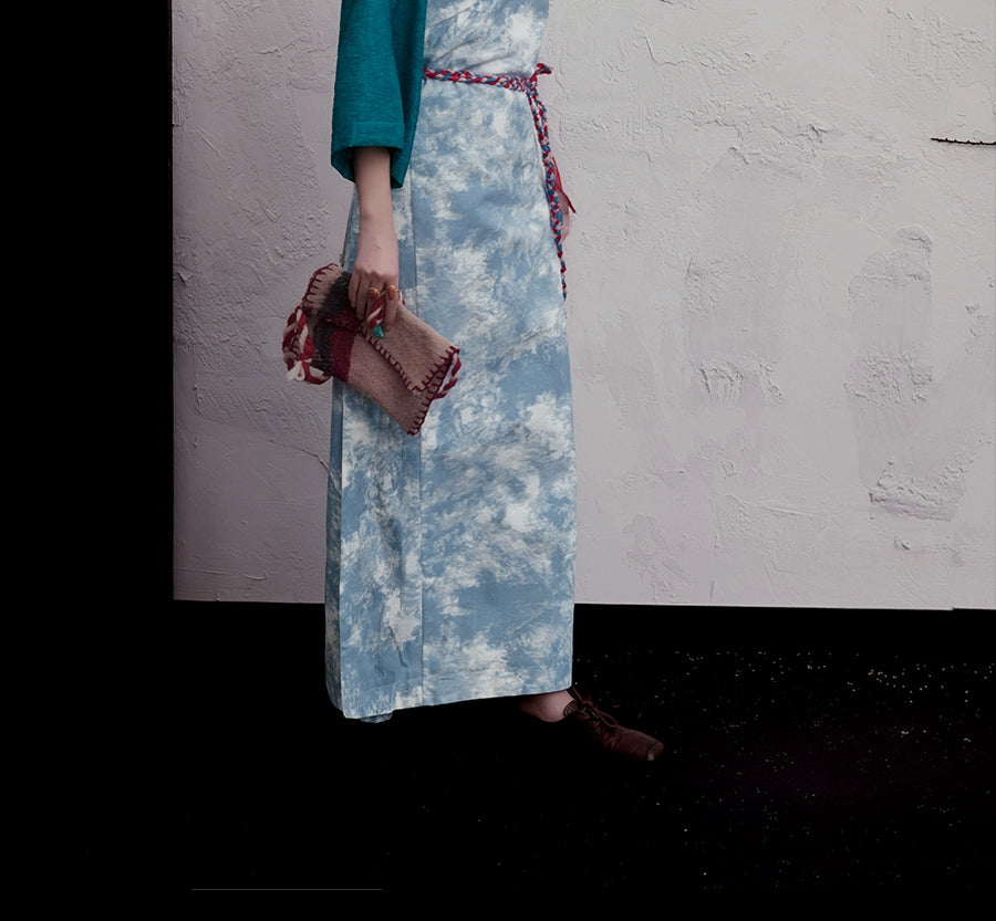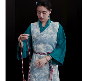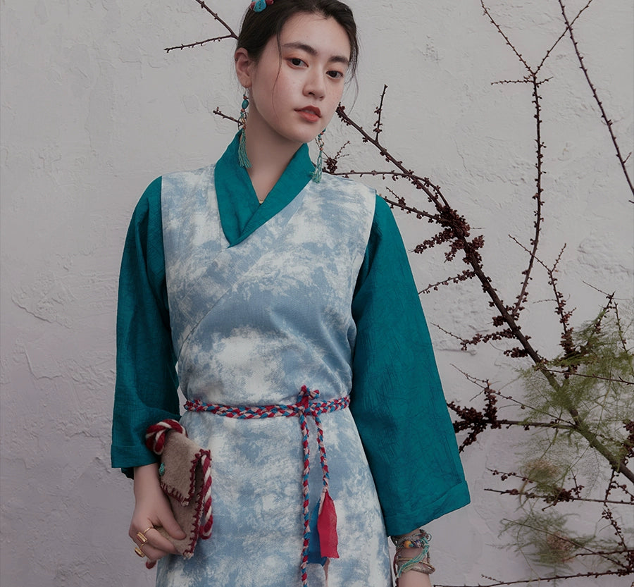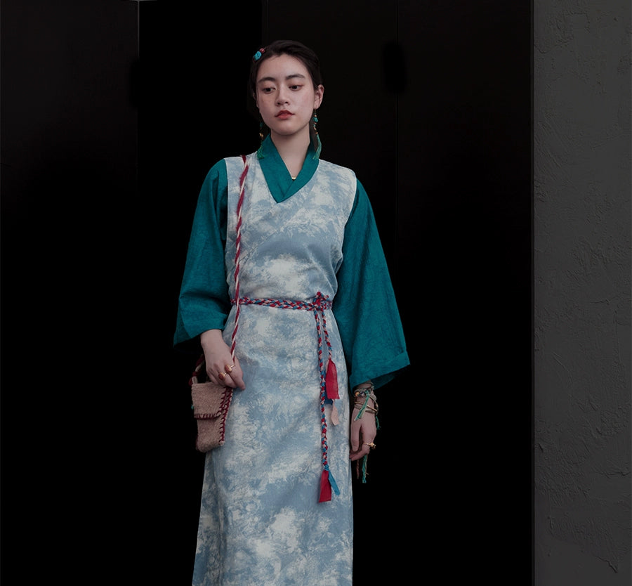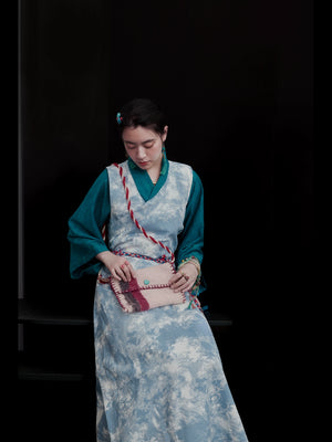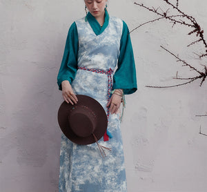 Ink-Dye V-Neck A-Line Dress – Modern Hanfu Silhouette with Tibetan-Inspired Details