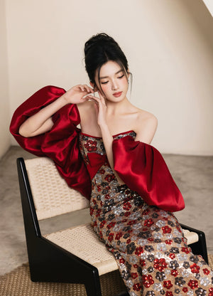 Available in the classic Flower Sequin [Luna] Dress and the romantic Red Bubble Sleeve version, this light luxury wedding dress is perfect for bridal ceremonies, morning robes, toast ceremonies, and formal banquets. The back strap design allows for a customizable bust fit, ensuring a flattering silhouette for every body type.