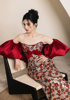 The Luna Wedding Dress is a celebration of light, luxury, and love. The flower sequin detailing catches every ray of light, creating a shimmering, ethereal effect that is nothing short of magical. Whether you choose the classic Luna Flower Sequin version or the passionate Red Bubble Sleeve style, this dress is designed to make you the most radiant person in the room on your wedding day.
