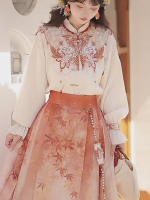 Conjunto de falda plisada con tres hombros y parte superior de hoja de arce Hanfu para mujer, estilo chino nuevo, para uso diario, primavera
