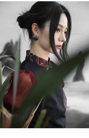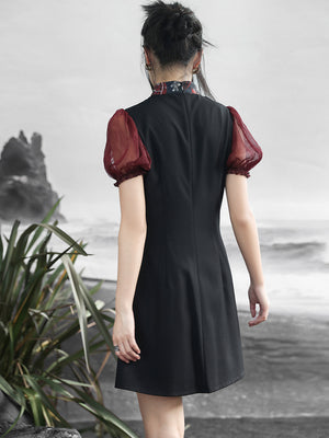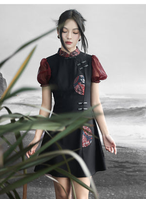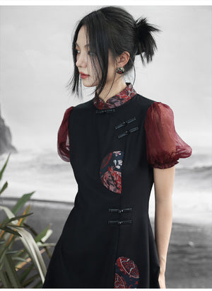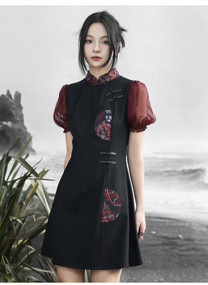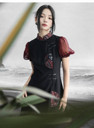 Falda de estilo chino retro con mangas abullonadas, estilo jacquard, con colores contrastantes y estilo fresco