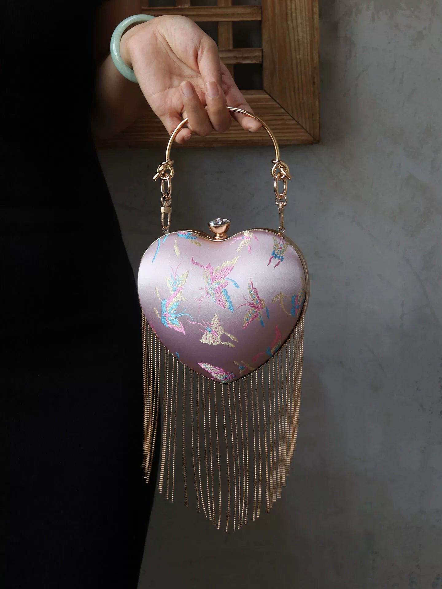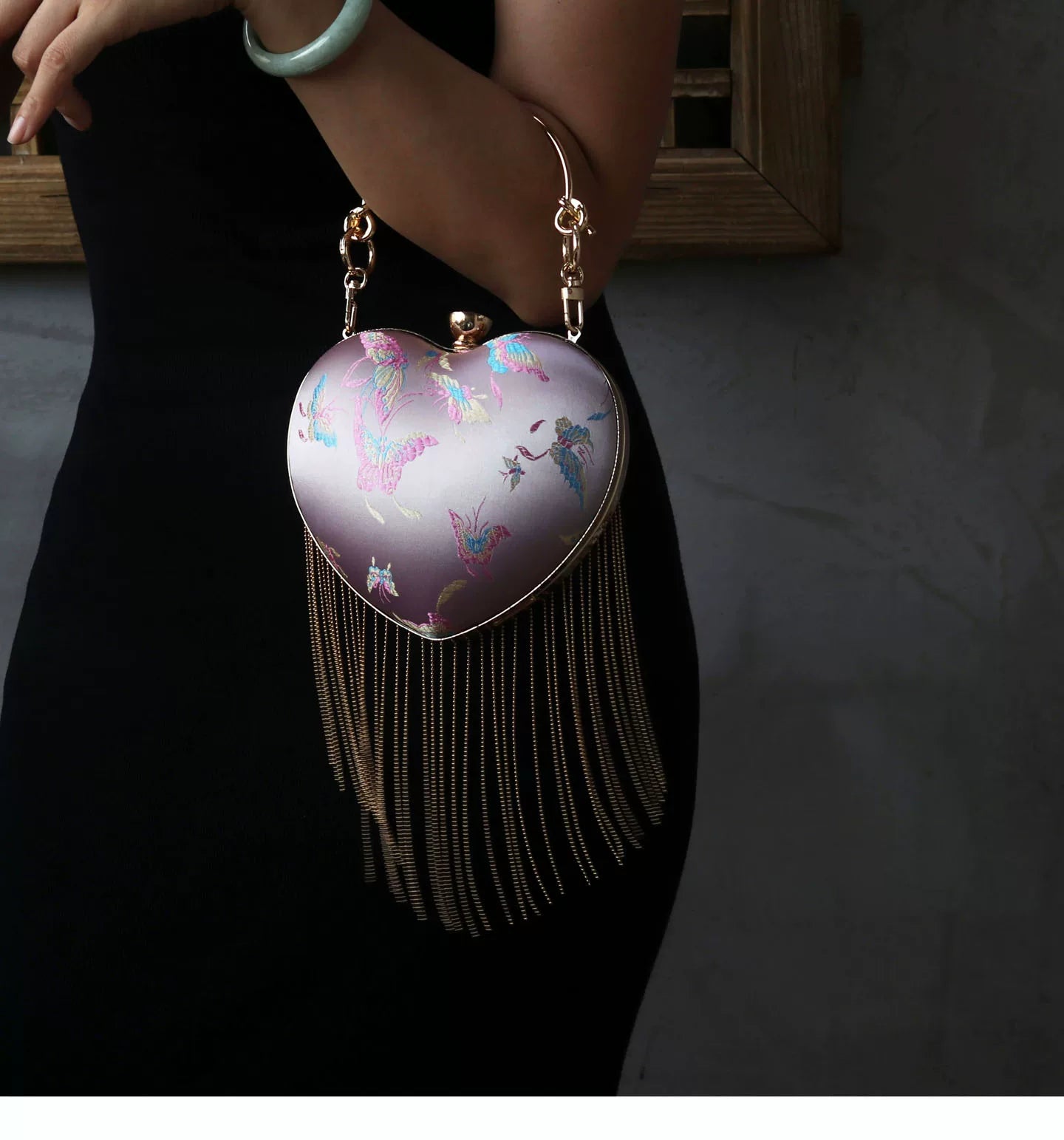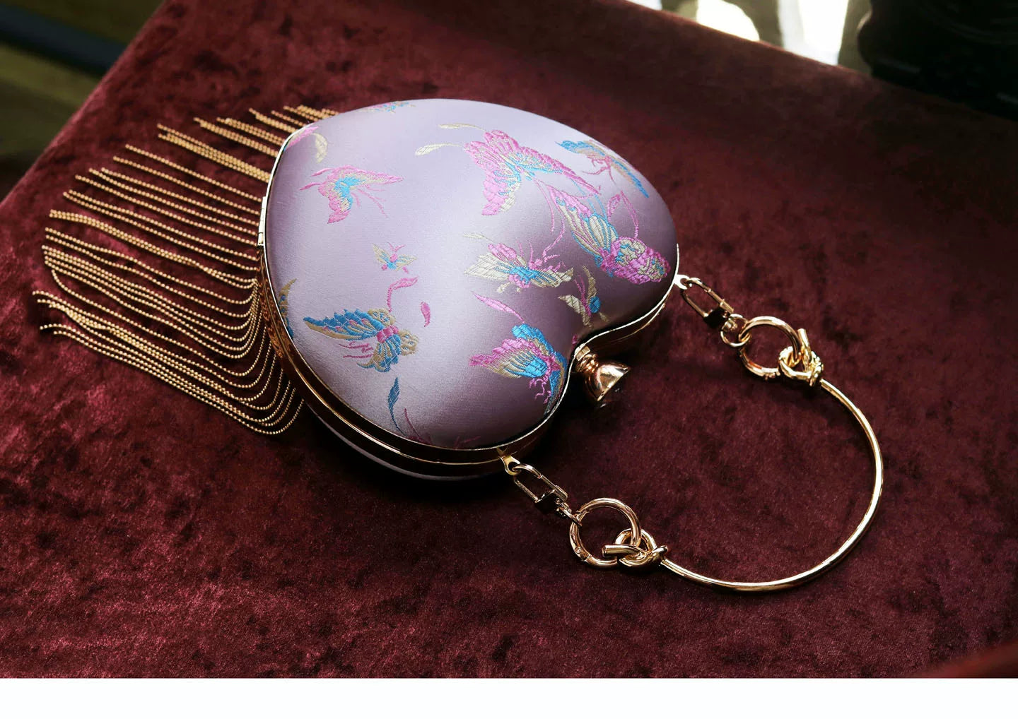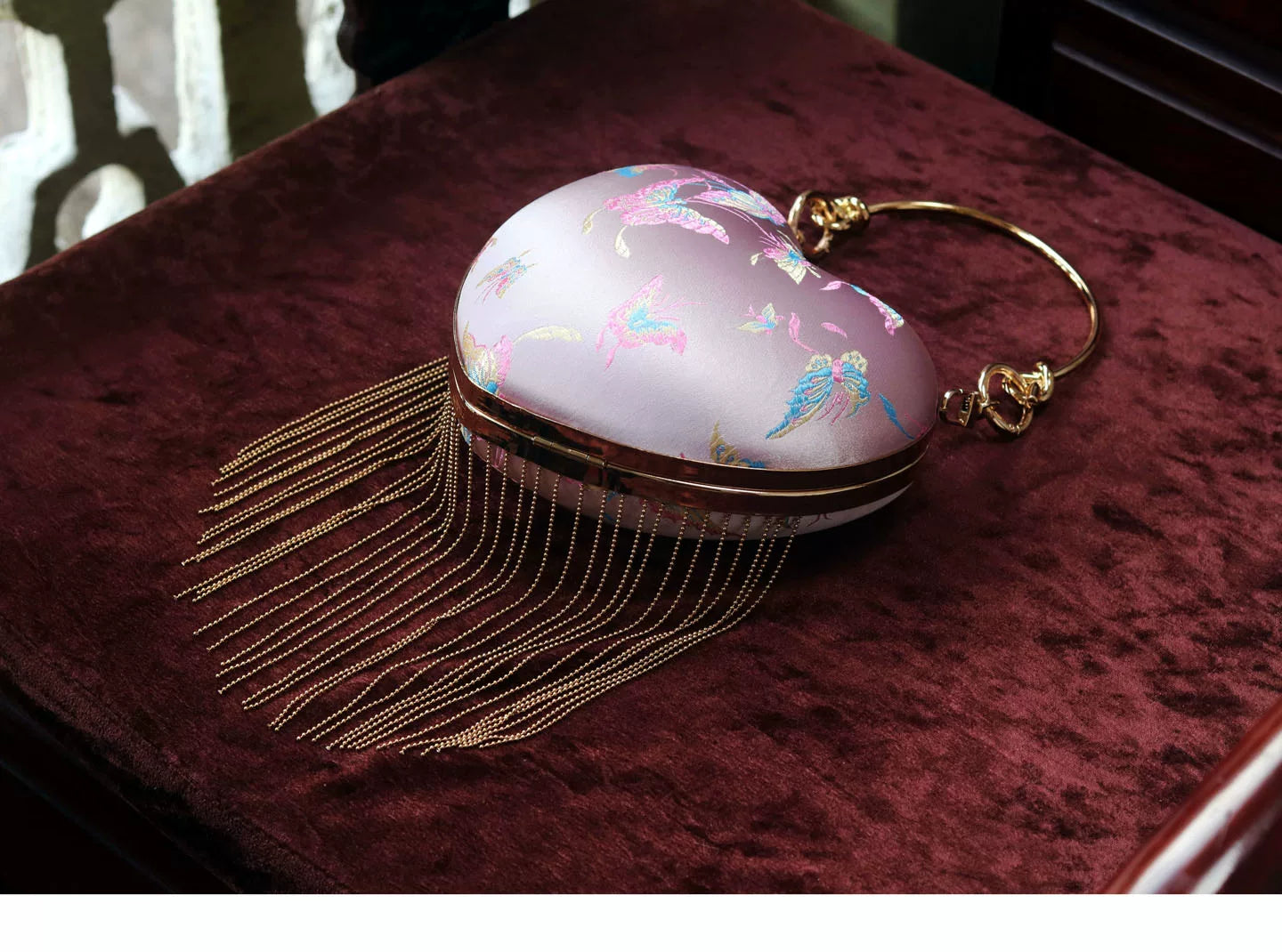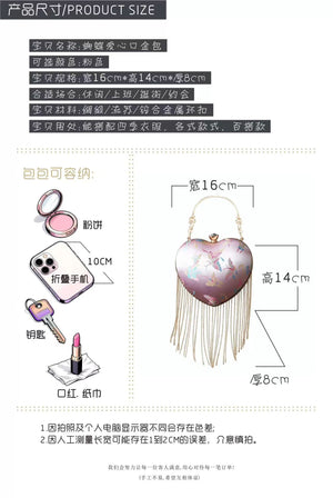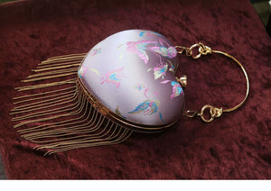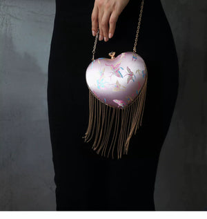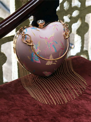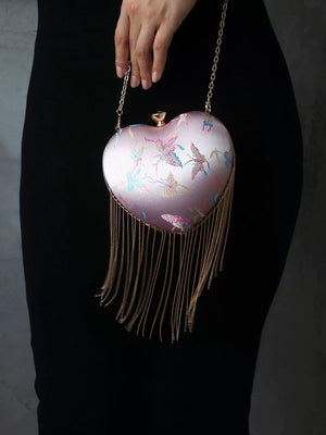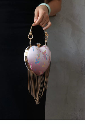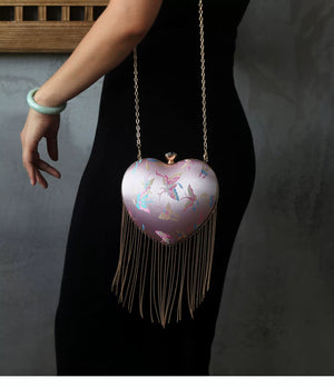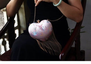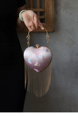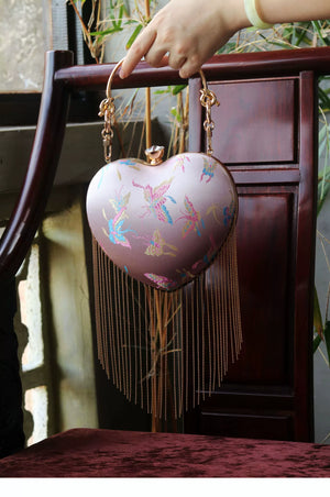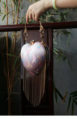 Discover this charming retro-inspired heart-shaped handbag featuring a romantic pink satin finish with elegant flowing fringe details. The classic kiss lock (mouth gold) closure adds vintage charm while the versatile design works perfectly as a shoulder bag or crossbody. This Chinese style handbag is the perfect accessory for adding a touch of romance and whimsy to any outfit.