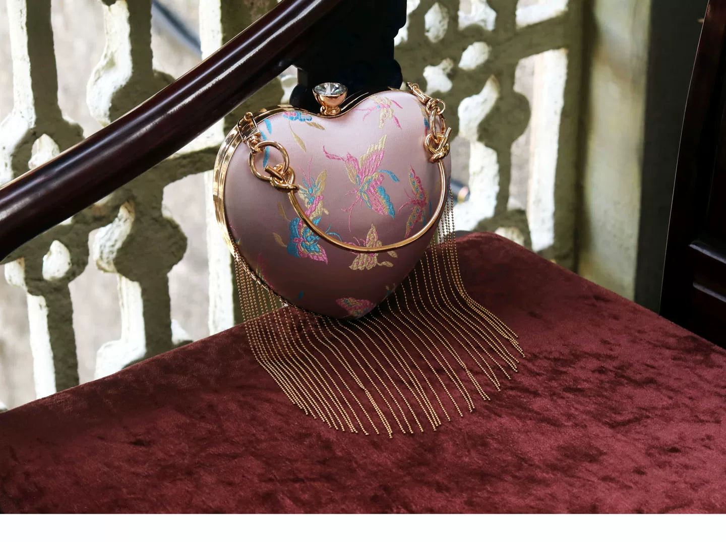 Special Features: Heart-shaped design, kiss lock closure, fringe details, versatile styling