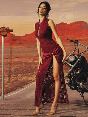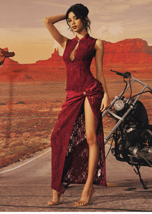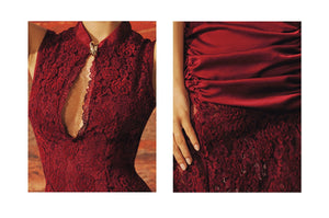 【Rebellious】 Red dress new Chinese cheongsam lace dress waist split stand-up collar Spice girl dress