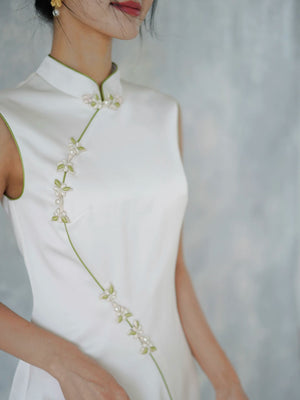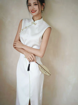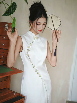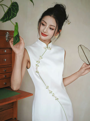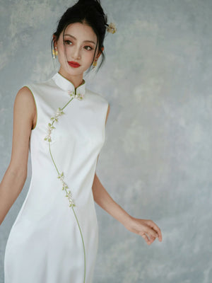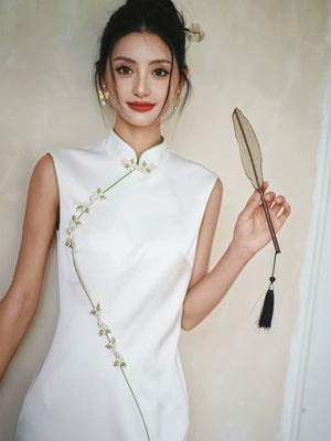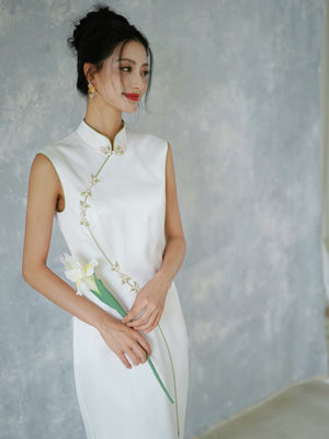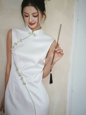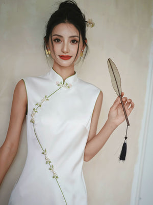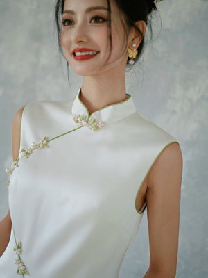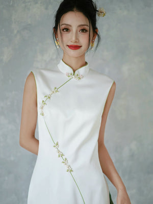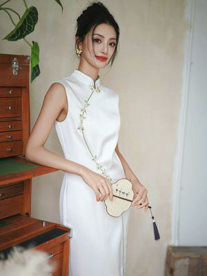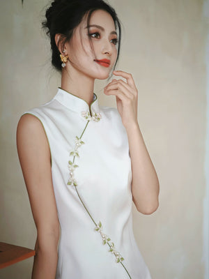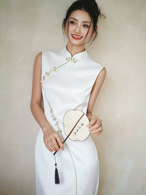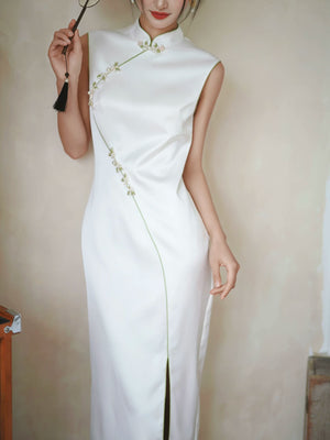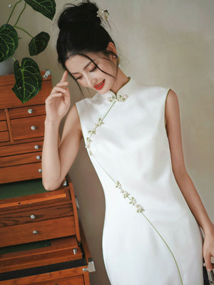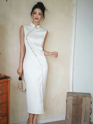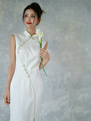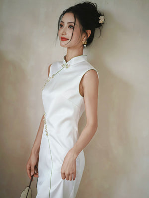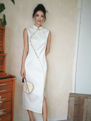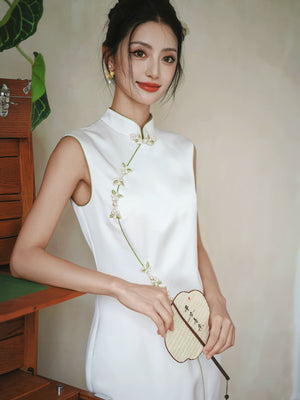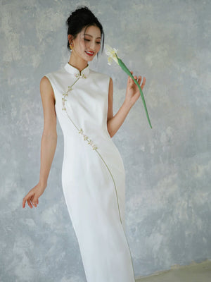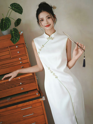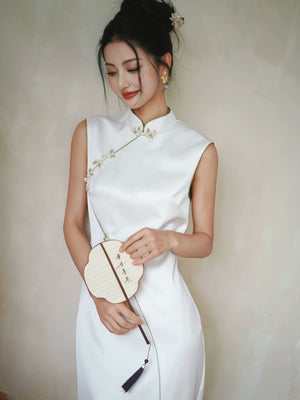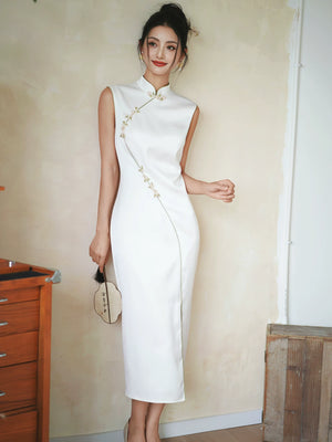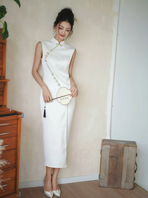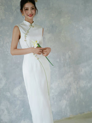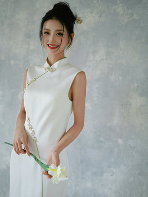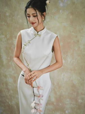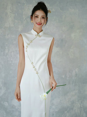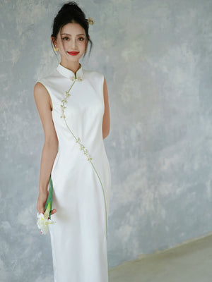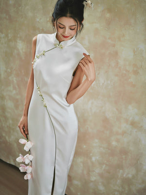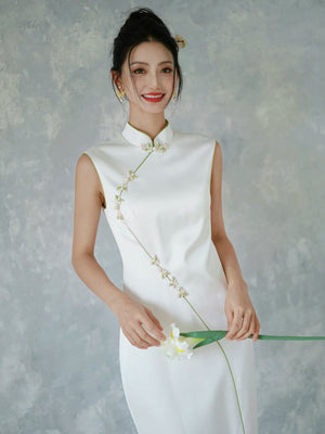 Pair this elegant white cheongsam with delicate jewelry, such as pearl or diamond accessories, and classic heels. Keep hair and makeup soft and romantic to complement the pure white color and create a sophisticated, bridal look.