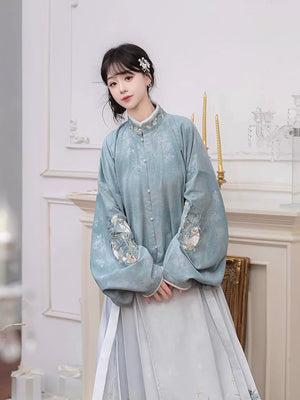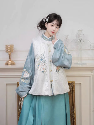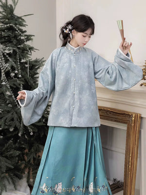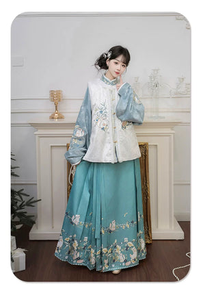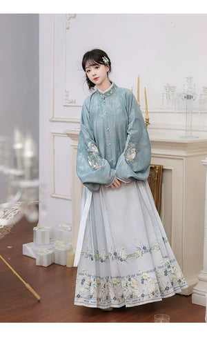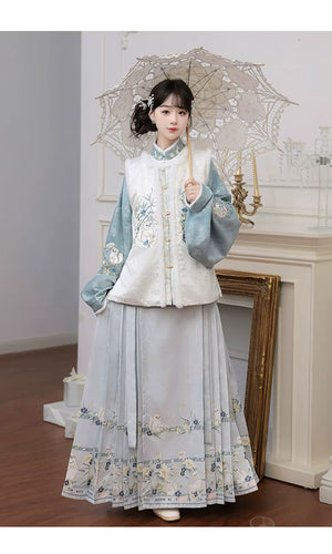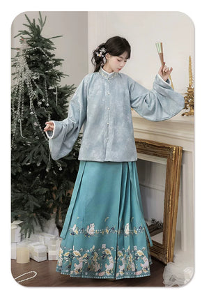 Discover the exquisite Snow Baby collection - a stunning Ming Dynasty-inspired Hanfu set featuring a round neck coat (or bijia vest), stand collar inner garment with pipa sleeves, and traditional horse face skirt. Available in elegant green or blue-gray color options, this winter ensemble combines authentic historical design with modern comfort. Perfect for cultural events, photoshoots, or daily Hanfu wear.