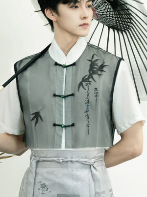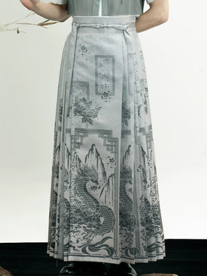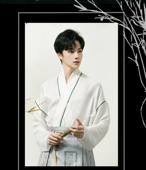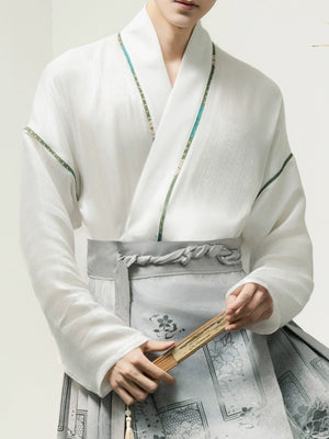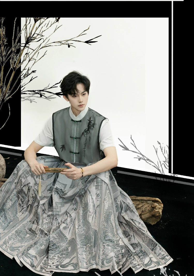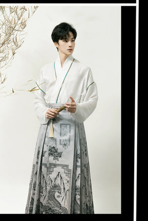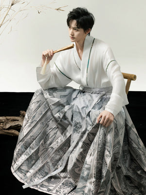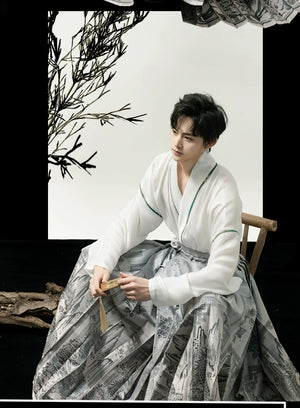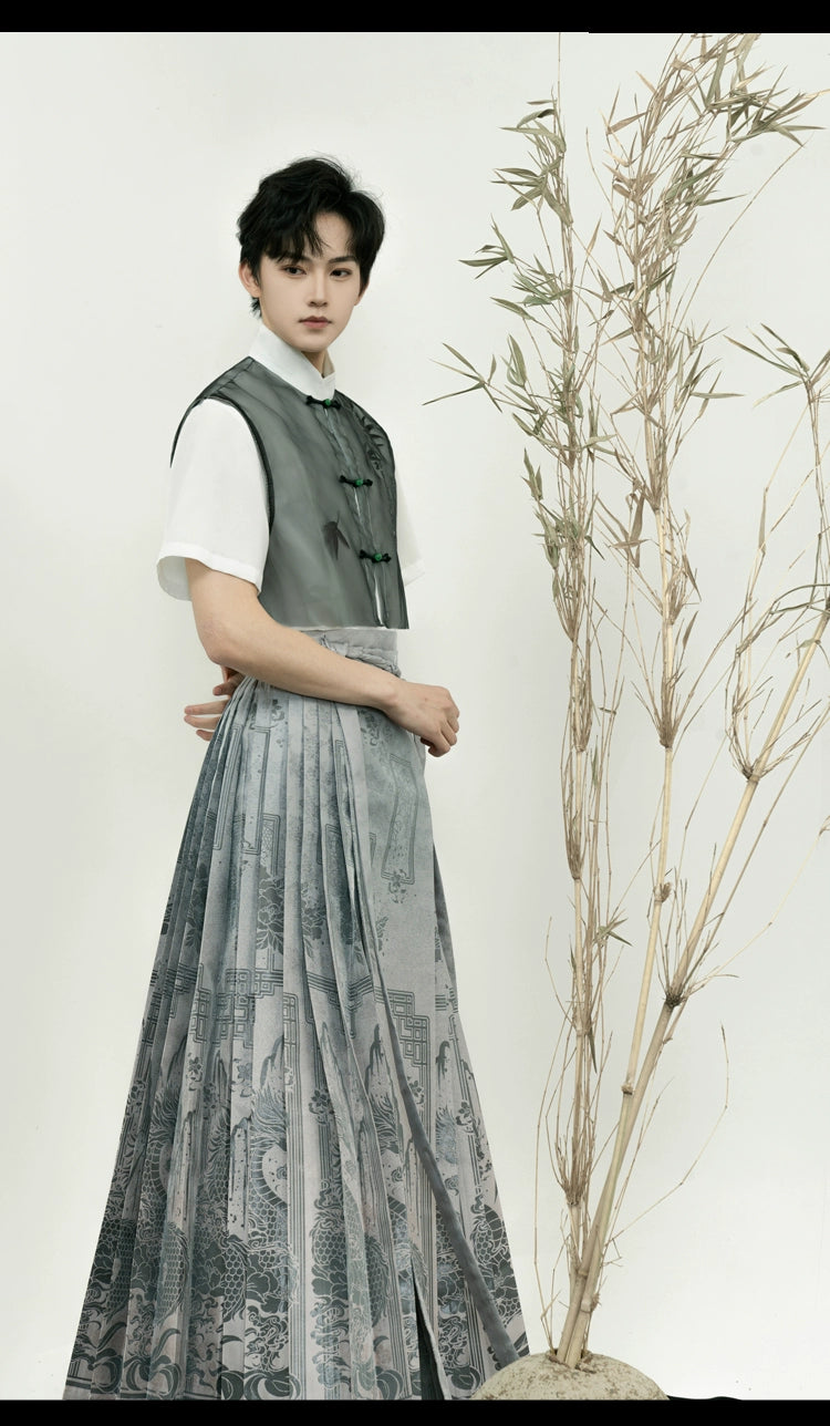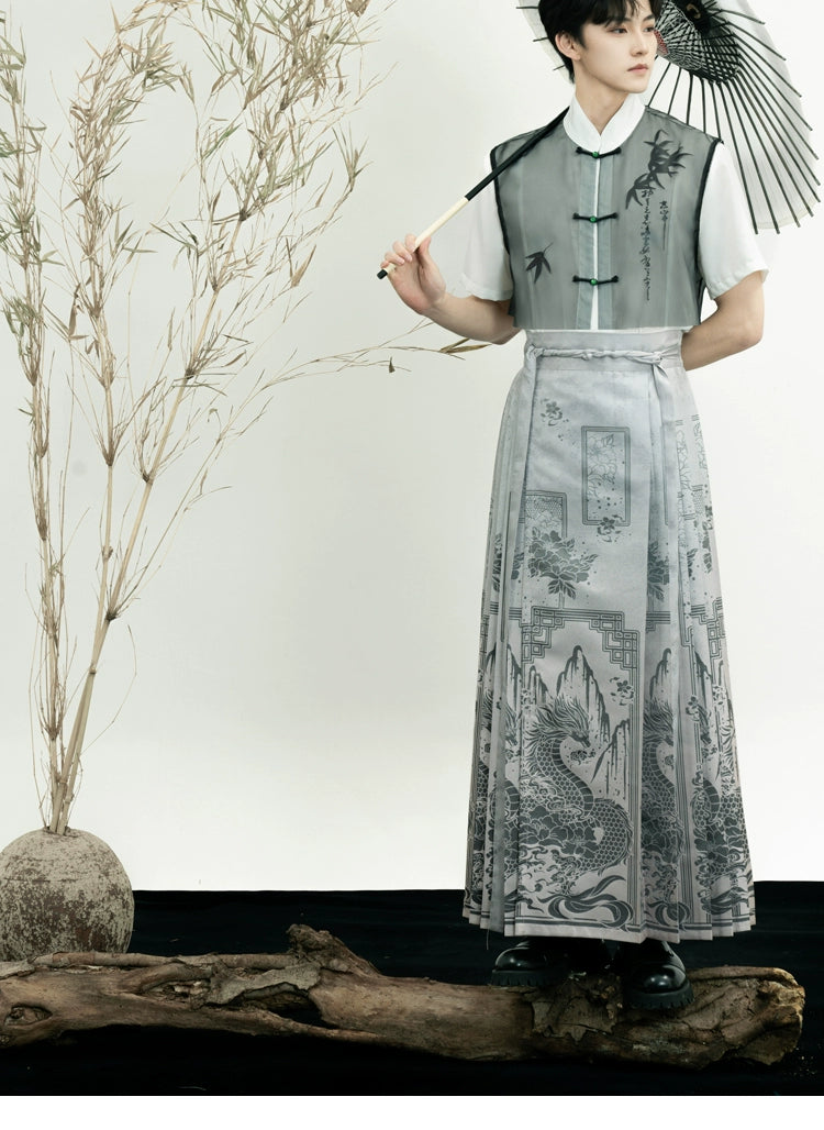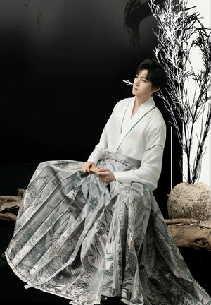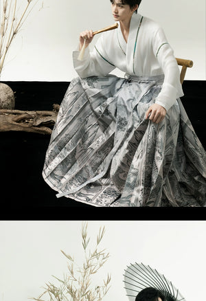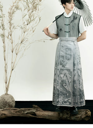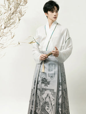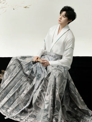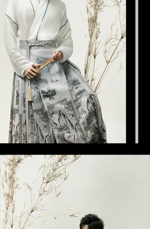 Unisex Modern Grey Hanfu Set – Cross-Collar Jacket with Brocade Ma Mian Skirt