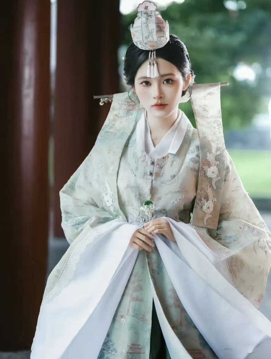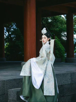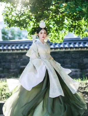 This stunning white and green Hanbok features traditional Korean court style design, perfect for photography sessions, cultural events, and special occasions. The elegant color combination of pure white top and sage green skirt creates a sophisticated and timeless look.