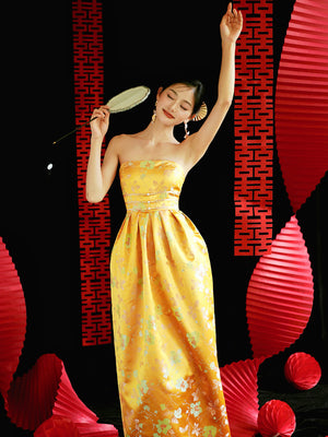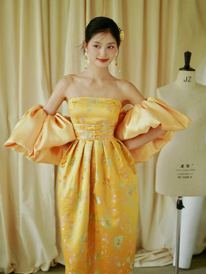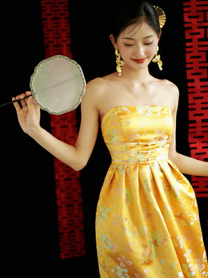 Vestido cheongsam de novia para embarazadas con jacquard amarillo "Yunjing"