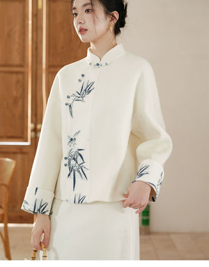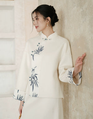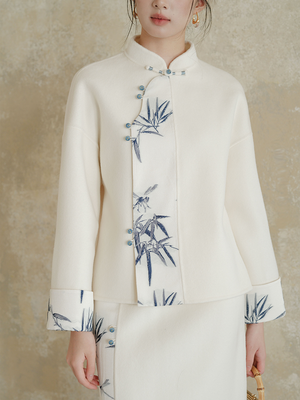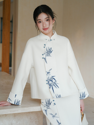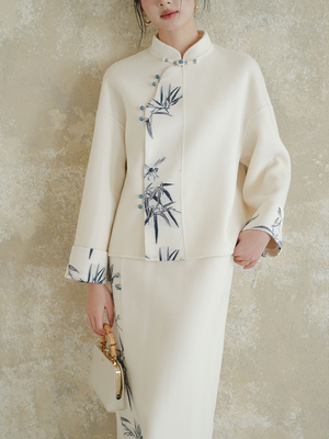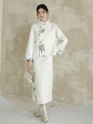 100% Wool Double-Faced Modern Chinese Women's Set – Printed Jacket with Matching Skirt, Minimalist Luxury Style