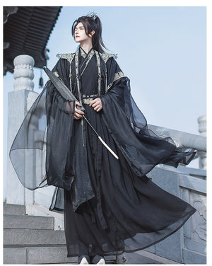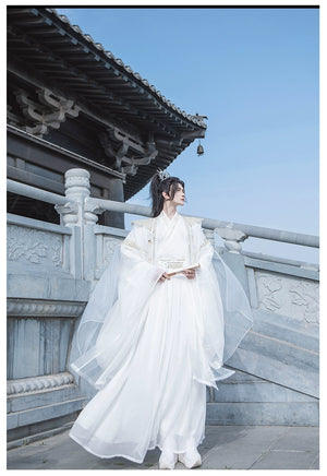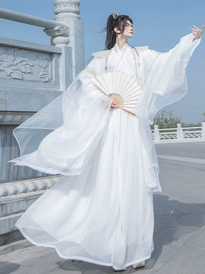 Cloud Collar Elegance – Unisex White Embroidered Modern Hanfu | Flowing Wide-Sleeve Wei-Jin Style Outfit