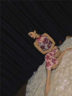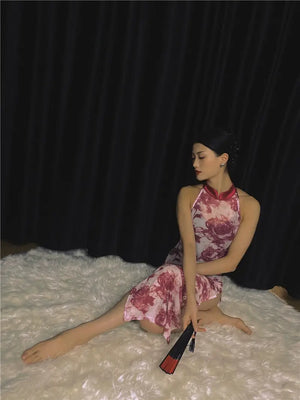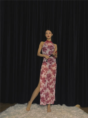 Elegant Sleeveless Red Floral Cheongsam – Modern Chinese-Style Vintage Long Qipao Dress