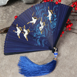 Blue bamboo folding fan with crane and wave design on wooden stand. Features blue tassel, ideal for Hanfu dance.