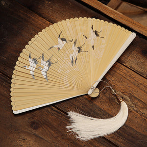 Cream and black bamboo folding fans with crane and cherry blossom designs. Includes white and black tassels for Hanfu dance.