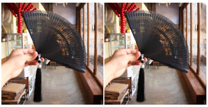 Black bamboo folding fan on wooden stand, minimalist design with black tassel. Suitable for traditional Chinese dance and Hanfu styling.