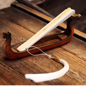 Natural bamboo folding fan with yellow tassel on wooden stand. Ideal for traditional Chinese performances and Hanfu styling.