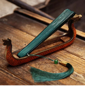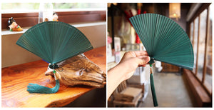 Assorted closed bamboo folding fans with tassels in white, black, and green. Ideal for Hanfu dance and traditional Chinese use.