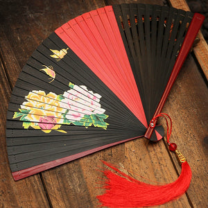 Black and red bamboo folding fan with colorful peony flowers and red tassel. Ideal for Hanfu dance and traditional styling.