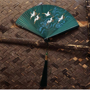 Green and black bamboo folding fans with crane and floral designs. Includes matching green tassels for Hanfu dance.